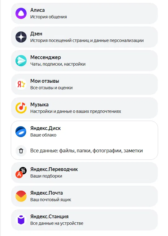 На данный момент пользователи могут удалить данные из таких сервисов как голосовой помощник «Алиса», «Яндекс.Музыка», «Яндекс.Карты», «Яндекс. Почта», «Яндекс.Диск», «Яндекс.Дзен», «Яндекс.Переводчик», «Яндекс.Погода», «Яндекс.Мессенджер», «Яндекс.Бизнес» и «Яндекс.Станция». Сообщается, что до конца 2021 года в перечень сервисов с возможность удаления пользовательских данных войдут все основные сервисы «Яндекс».