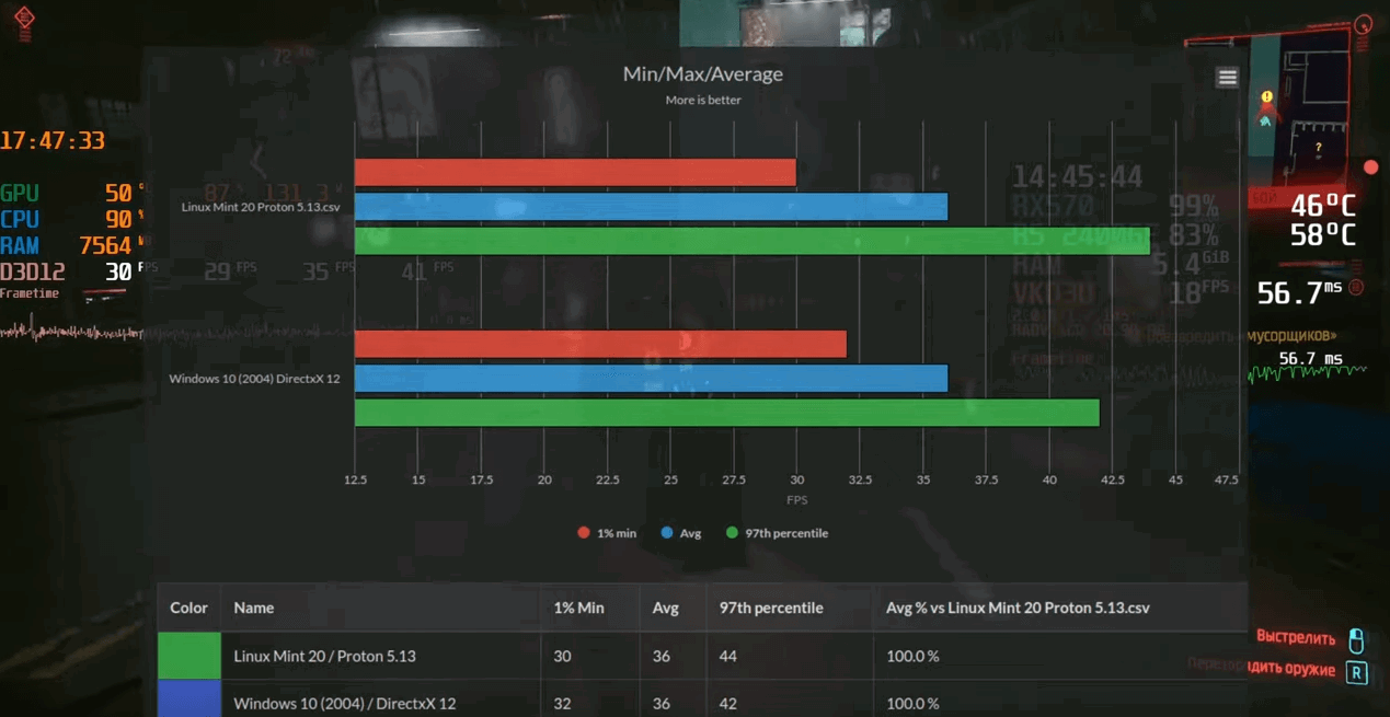 Стоит отметить, что производительность функции Proton также значительно улучшилась, теперь разница в fps по сравнению с игровым процессом в Windows не столь значительна, а порой и вовсе не отличается. Например, в следующем обзоре запуска игры CyberPunk2077 в Linux, мы может увидеть идентичные средние результаты fps в Linux и Windows 10.
