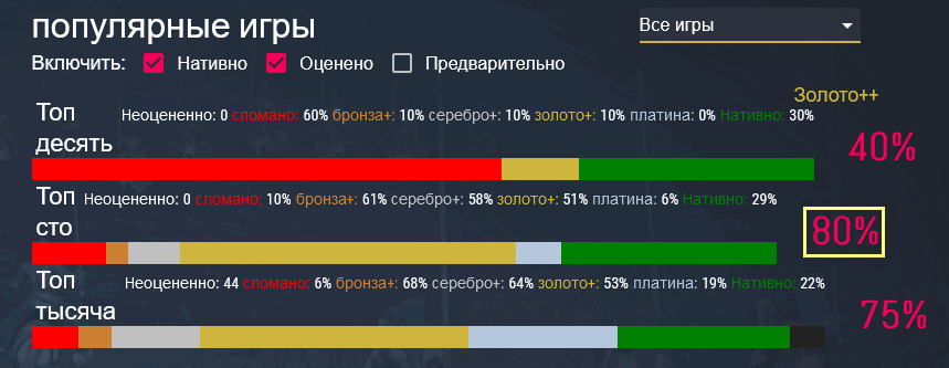По этим причинам, статистика в виде результата поддержки 80% игр из списка 100 лучших игр Steam, является ожидаемым результатом.