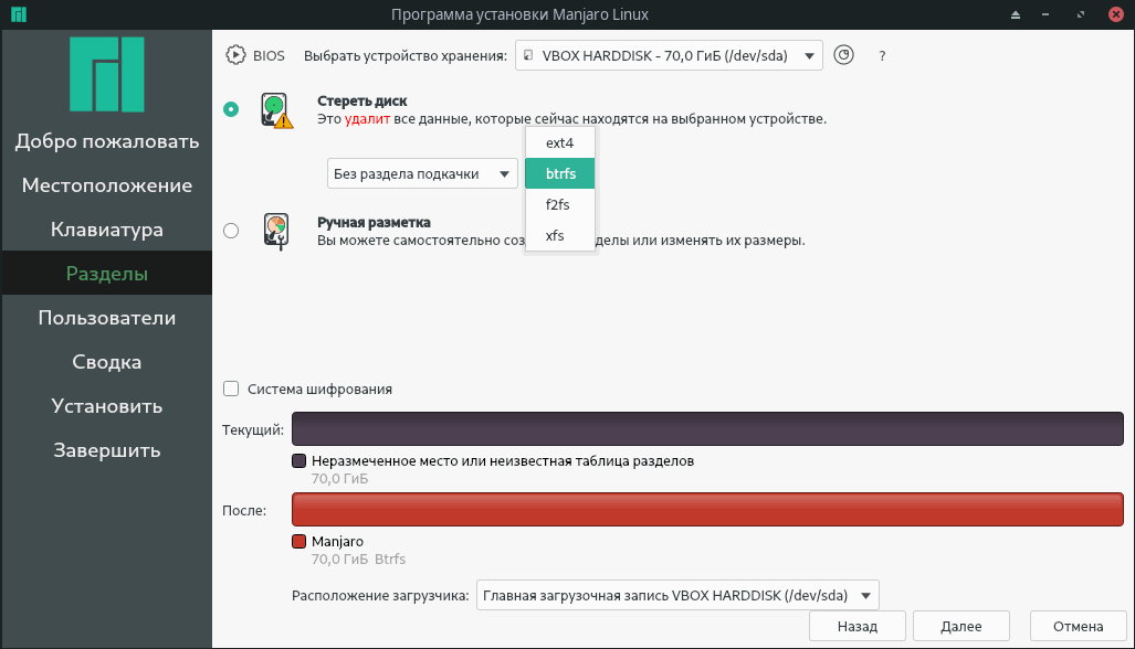 Значительные улучшения получил установщик Calamares, который теперь предлагает выбор файловой системы для автоматического разбиения на разделы и расширенную поддержку btrfs. Для установок btrfs макет вложенного тома по умолчанию был улучшен для упрощения откатов и уменьшения потерь места на снимках. Кроме того, теперь поддерживаются файлы подкачки в файловой системе btrfs.