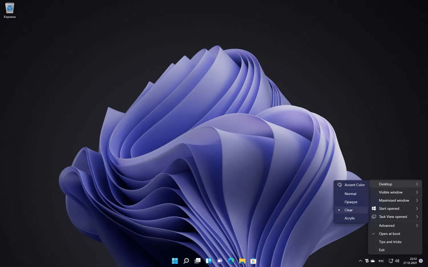 При запуске приложение добавляет значок в область на панели задач. Щелкните значок правой кнопкой мыши и выберите Desktop > Clear, чтобы получить полностью прозрачную панель задач. Приложение поддерживает другие состояния панели задач; поэкспериментируйте с ними, чтобы найти вариант, который лучше всего подходит для вас. Цвета можно настроить для каждого состояния, кроме состояния Normal.