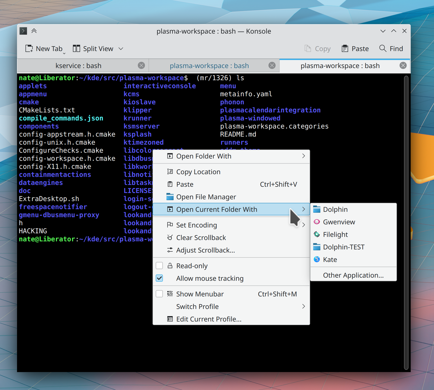 - Приложение Konsole теперь позволяет открывать текущий каталог или любую другую папку, которую вы щелкаете правой кнопкой мыши в любом приложении, а не только в файловом менеджере. (Konsole 22.04)