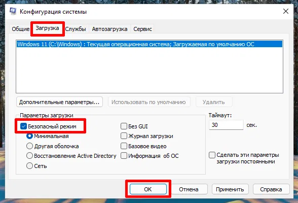 Перейдите на вкладку Загрузка, отметьте опцию Безопасный режим и нажмите OK.