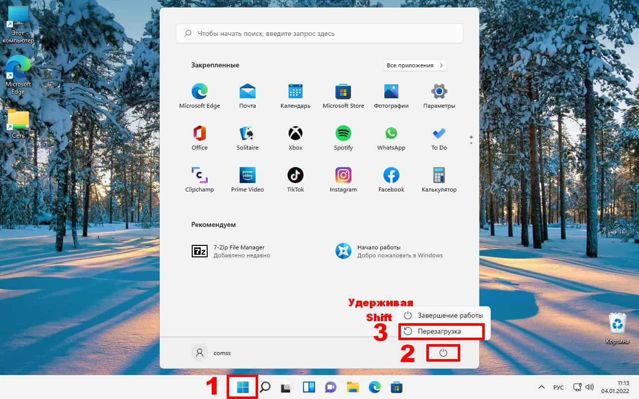 Самый простой способ для перезагрузки системы в Безопасном режиме доступен через кнопку питания в меню Пуск. Откройте меню Пуск, щёлкните по кнопке питания (в правом нижнем углу) и, удерживая клавишу Shift, нажмите ссылку Перезагрузка.