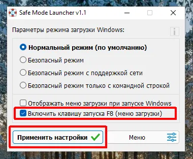 В окне программы отметьте пункт Включить клавишу запуска F8 и нажмите Применить настройки.