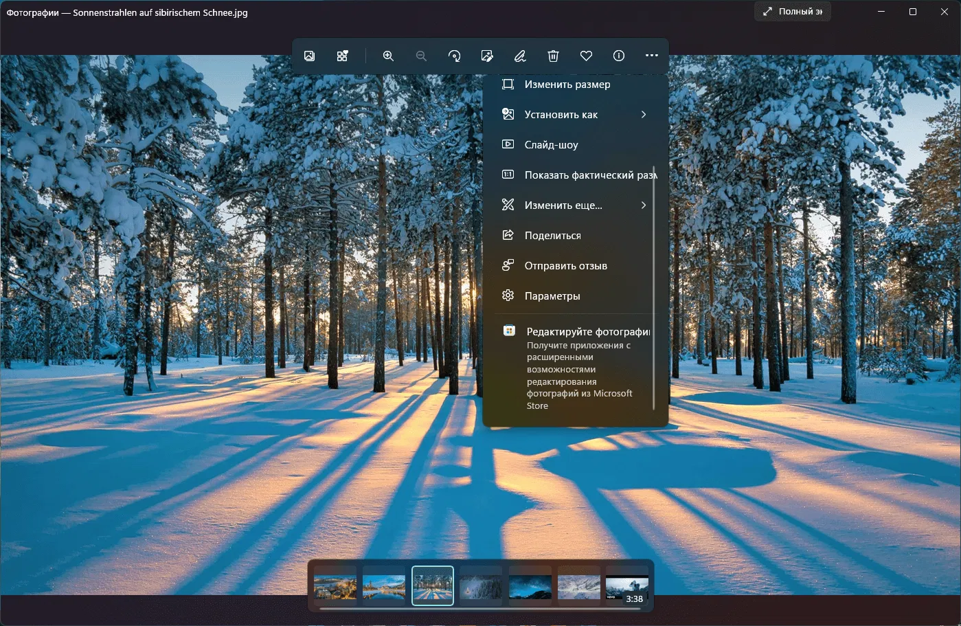 Графический интерфейс программы соответствует дизайну Windows 11 с закругленными углами и поддерживает эффект Mica. На главном экране, внизу экрана приложения теперь отображается панель миниатюр, которая действует как мини-галерея для отображения всех изображений из одной папки. Вверху есть кнопка включения полноэкранного отображения, с помощью которой вы можете включать полноэкранный режим для захватывающего просмотра. Это выглядит красиво, но расположение кнопки странное. Вы также можете воспользоваться клавишей F11 для перехода в полноэкранный режим.