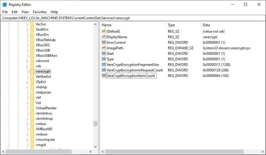 HKEY_LOCAL_MACHINE\SYSTEM\CurrentControlSet\Services\veracrypt