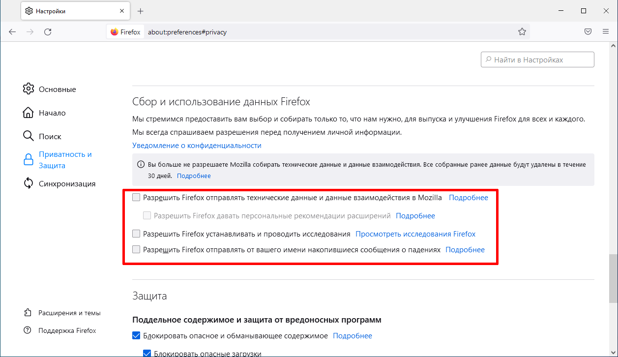 - Снимите все флажки в разделе Сбор и использование данных Firefox: