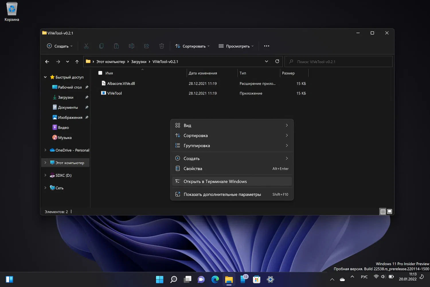 - Перейдите в папку ViveTool и нажмите правой кнопкой мыши в любом свободном месте папки – выберите Открыть в Терминале Windows.