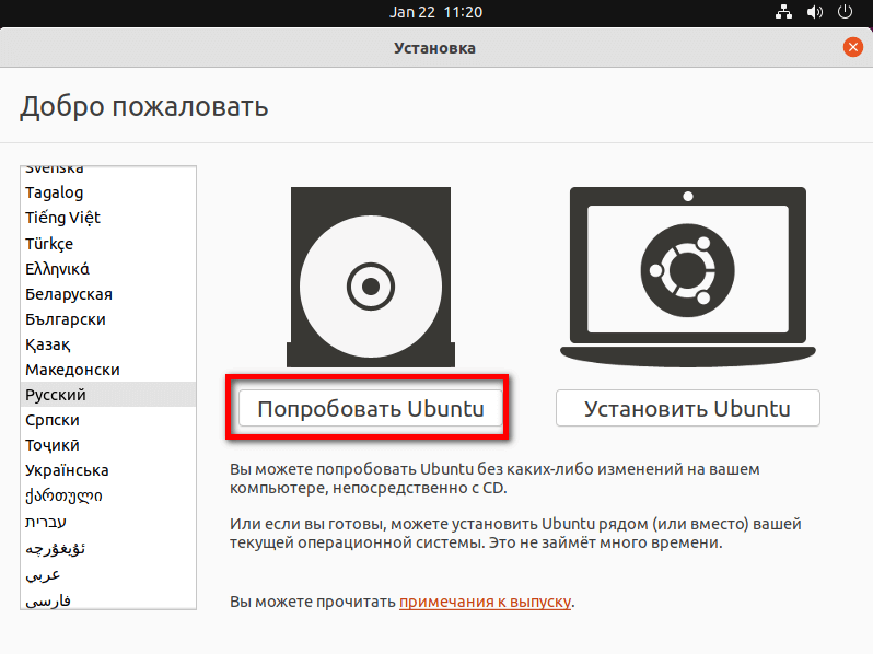 - При загрузки установочного образа Ubuntu выберите вариант Попробовать Ubuntu.