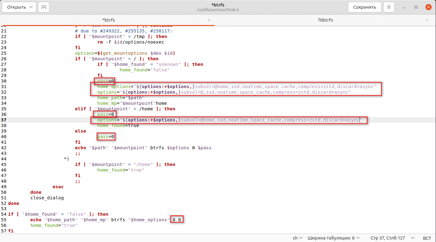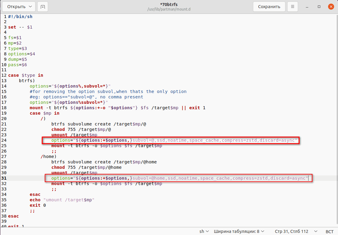 sudo gedit /usr/lib/partman/mount.d/70btrfs