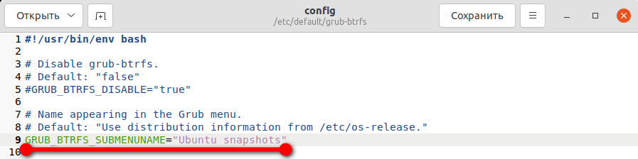 Раскомментируем строку GRUB_BTRFS_SUBMENUNAME (уберем значок #) и изменим название на используемый дистрибутив: