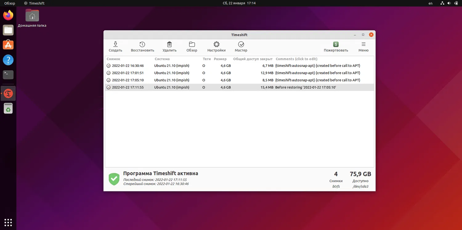 - Доступен пользовательский ISO-образ Ubuntu 21.10 с настроенным BTRFS и предустановленным Timeshift