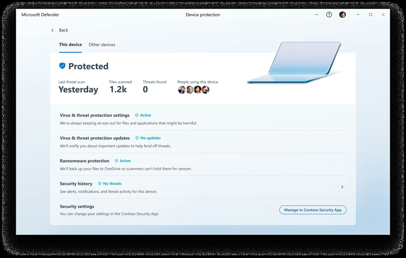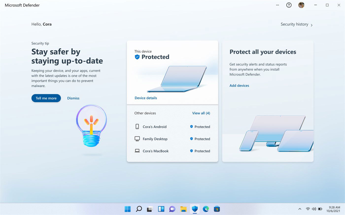 Предварительная версия Microsoft Defender предоставляет потребителям централизованное представление для управления и мониторинга статуса безопасности. Пользователи смогут видеть текущее состояние своего ПК с Windows, а также состояние еще четырех дополнительных устройств (при условии, что они вошли в систему с использованием одной и той же личной учетной записи Microsoft), включая смартфоны iPhone/Android и компьютеры Mac. Пользователи смогут добавлять или удалять устройства и просматривать средства защиты от вредоносных программ на всех защищенных устройствах. Приложение также предоставит рекомендации по обеспечению лучшей защиты данных, советы по безопасности и будет показывать предупреждения безопасности в режиме реального времени.