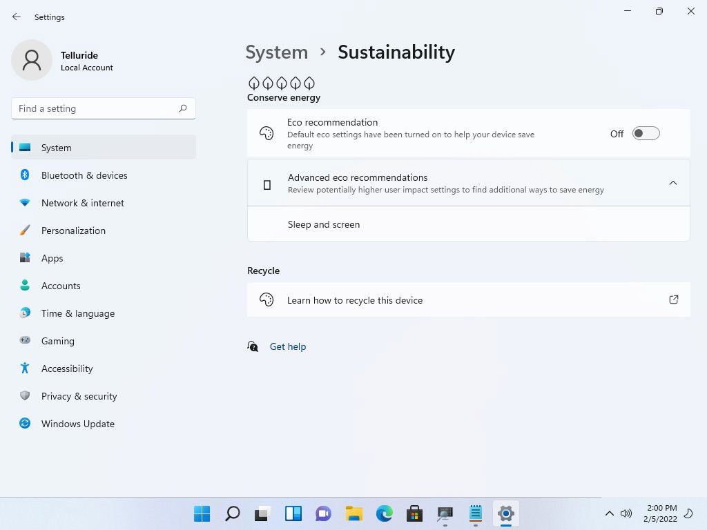 В панель настроек «Параметры» добавлен новый режим «Sustainability», который призван помочь и напомнить нам об улучшении управления питанием устройства. Инсайдер Albacore считает, что что глифы в форме листьев, присутствующие в верхней части страницы, предназначены для отображения "экологической оценки" ПК.