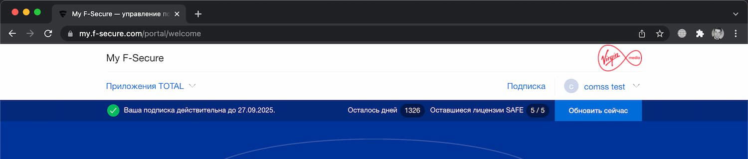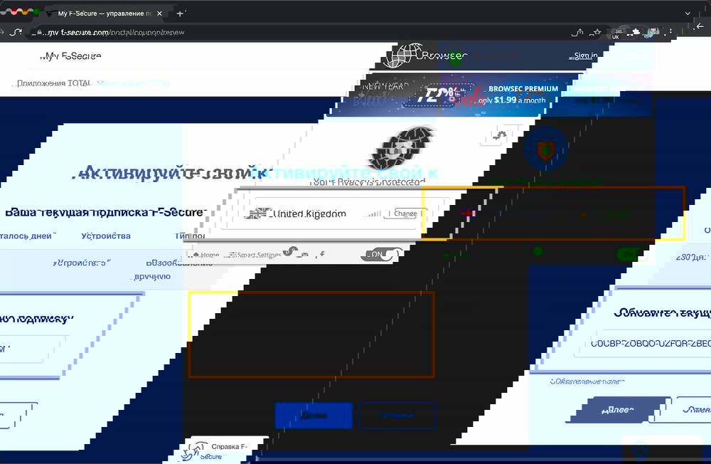2. Обновите текущую подписку F-Secure SAFE, используя следующий код: