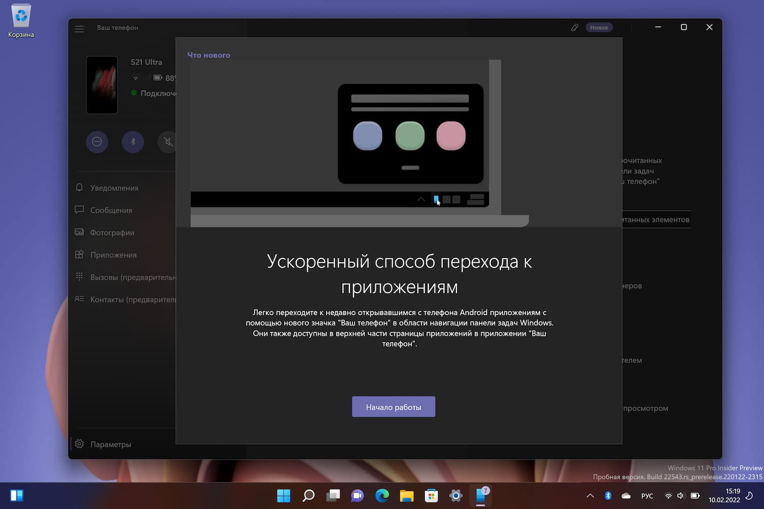 - Функция добавляет значок «Ваш телефон» в системный трей для быстрого доступа к Android-приложениям, которые вы недавно использовали на смартфоне.