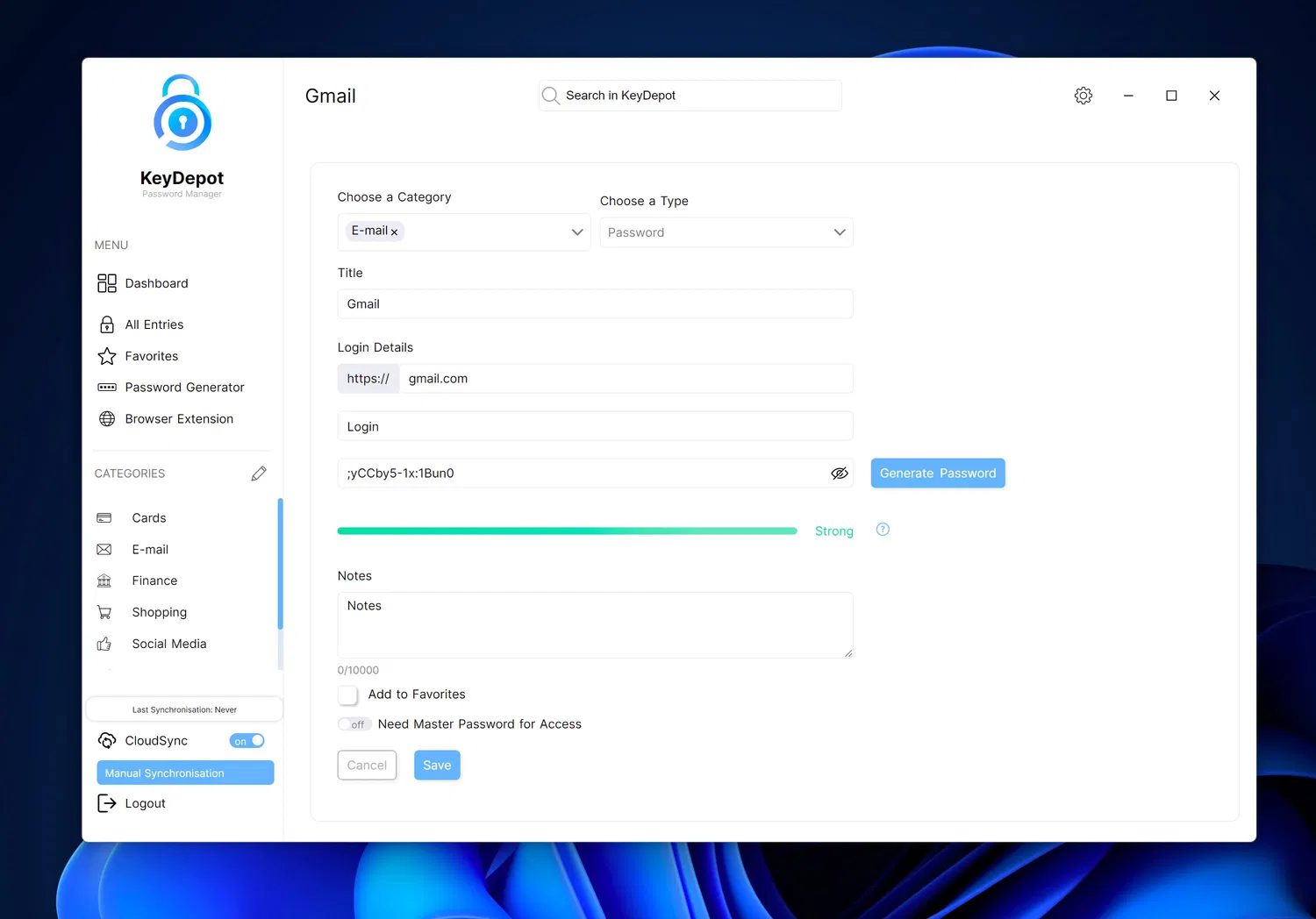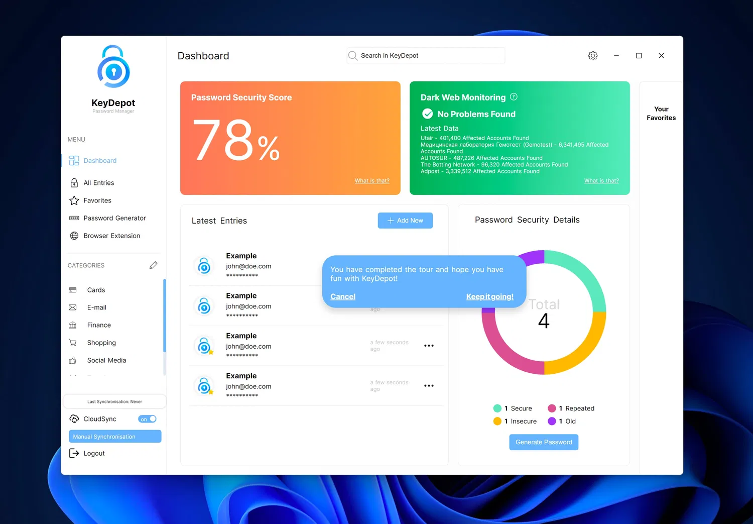 Дополнительно KeyDepot 2026 следит за «качеством» ваших паролей с помощью проверки безопасности и показывает оценку (security score), подсказывая, какие записи стоит усилить. Для пользователей, которым нужна работа на нескольких устройствах, предусмотрена синхронизация CloudSync.