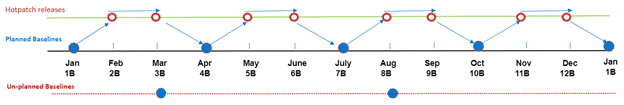 Корпорация Майкрософт проводит различие между запланированными и незапланированными базовыми уровнями. Запланированные базовые планы выпускаются регулярно, чтобы перевести систему на новый базовый уровень. Затем между этими запланированными базовыми выпусками могут быть установлены оперативные исправления.