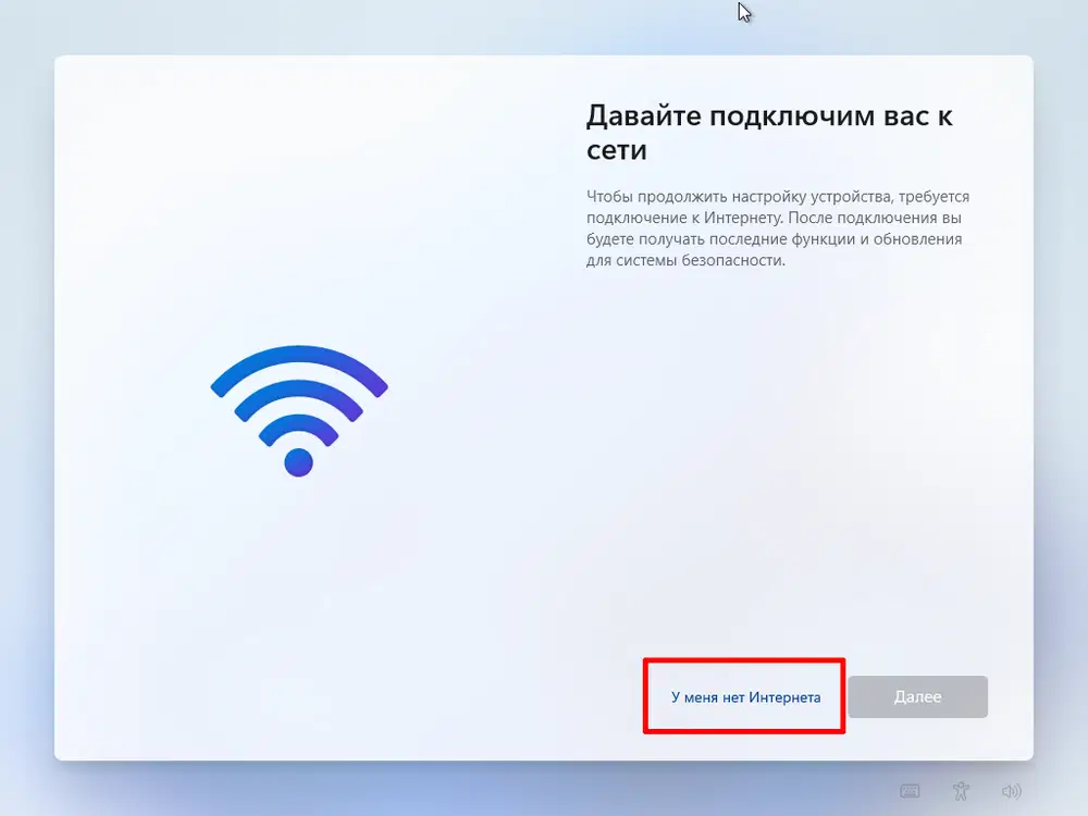 3. Будет выполнена перезагрузка системы. После выбора языка и раскладки клавиатуры вы должны увидеть новую опцию У меня нет Интернета.