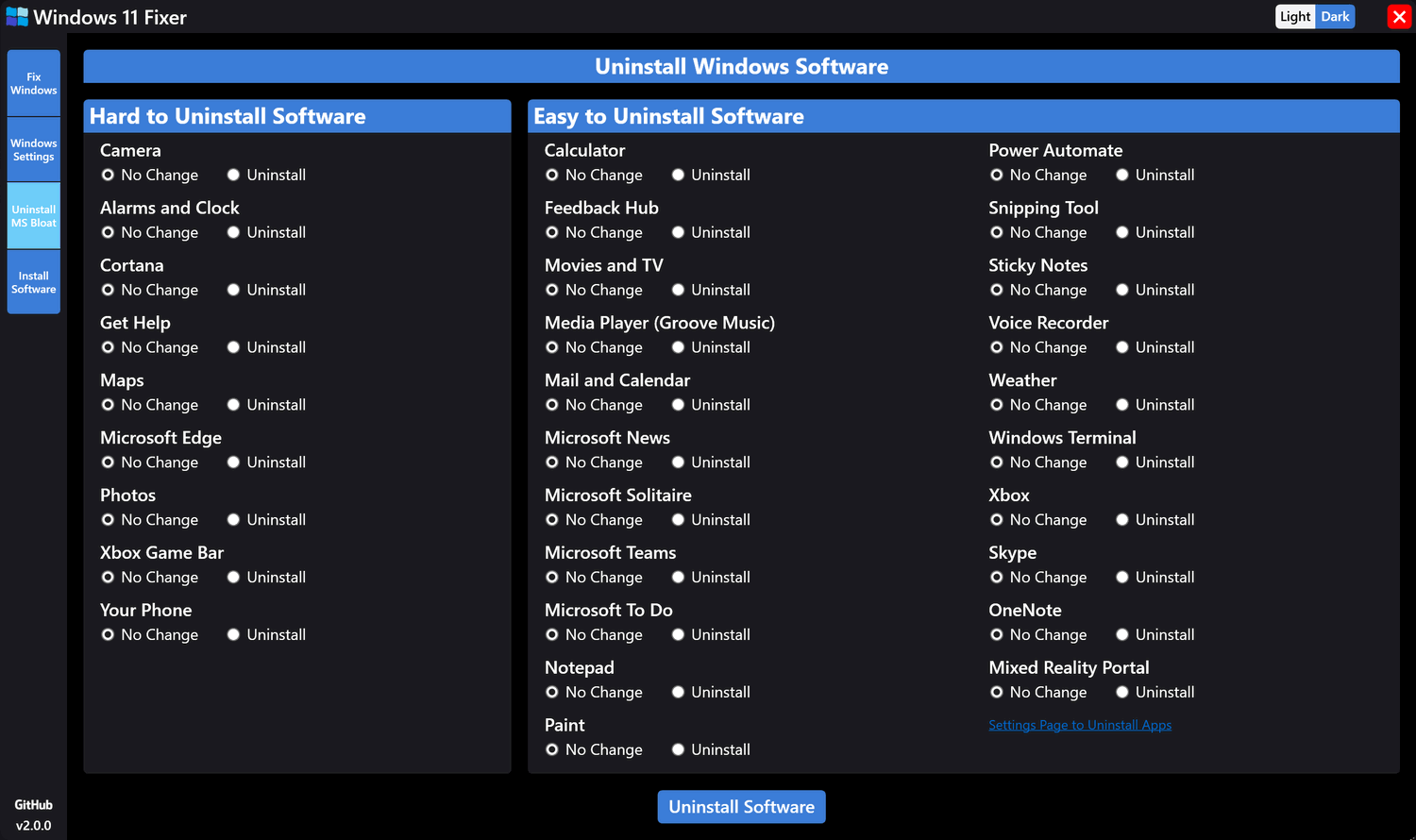 - Удаление предустановленных приложений. Приложения разбиты на две групп: простые и сложные для удаления. Вы можете использовать раздел для удаления из ОС приложений, таких как Paint, Microsoft To Do, Microsoft Teams или Skype.