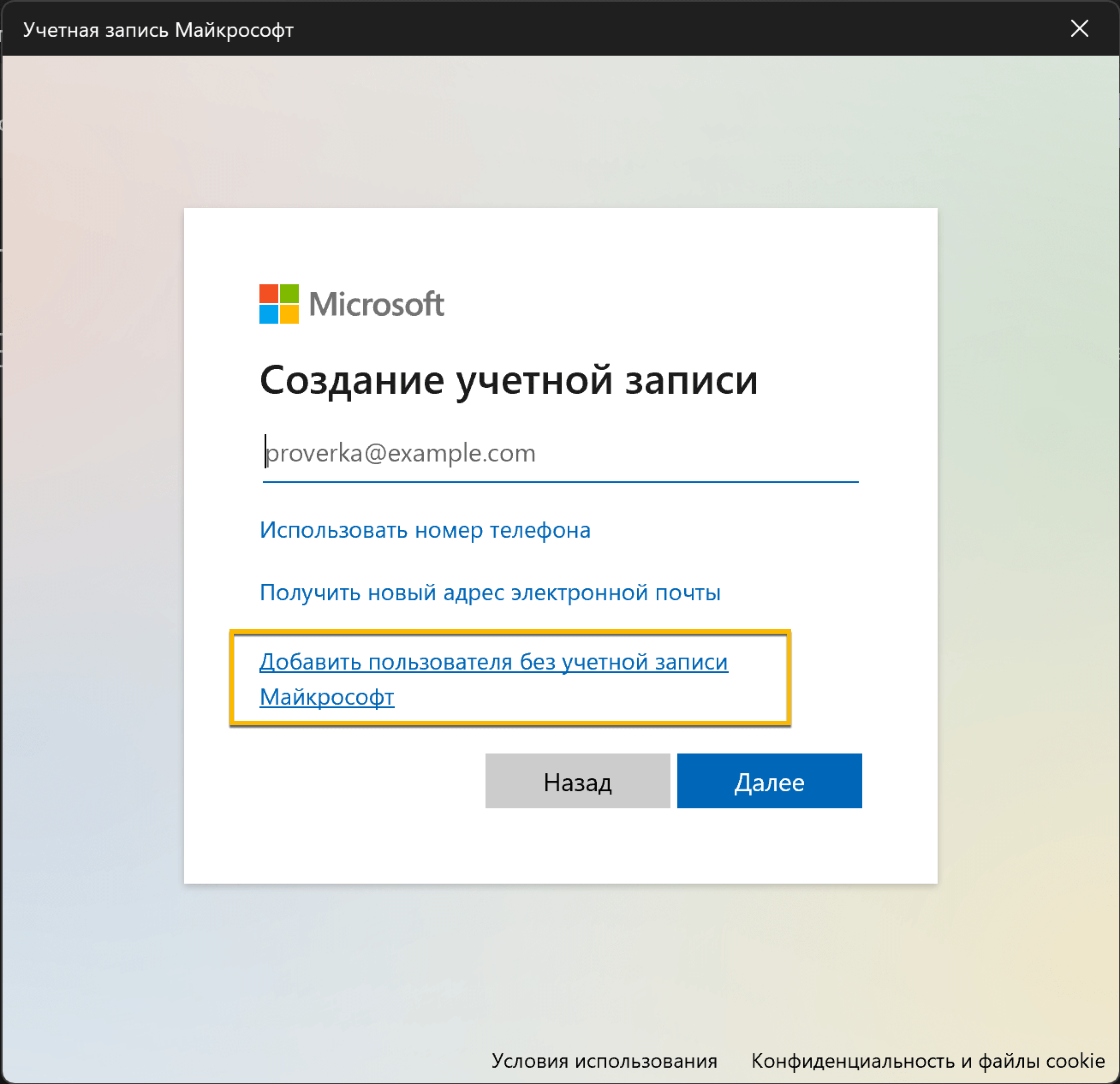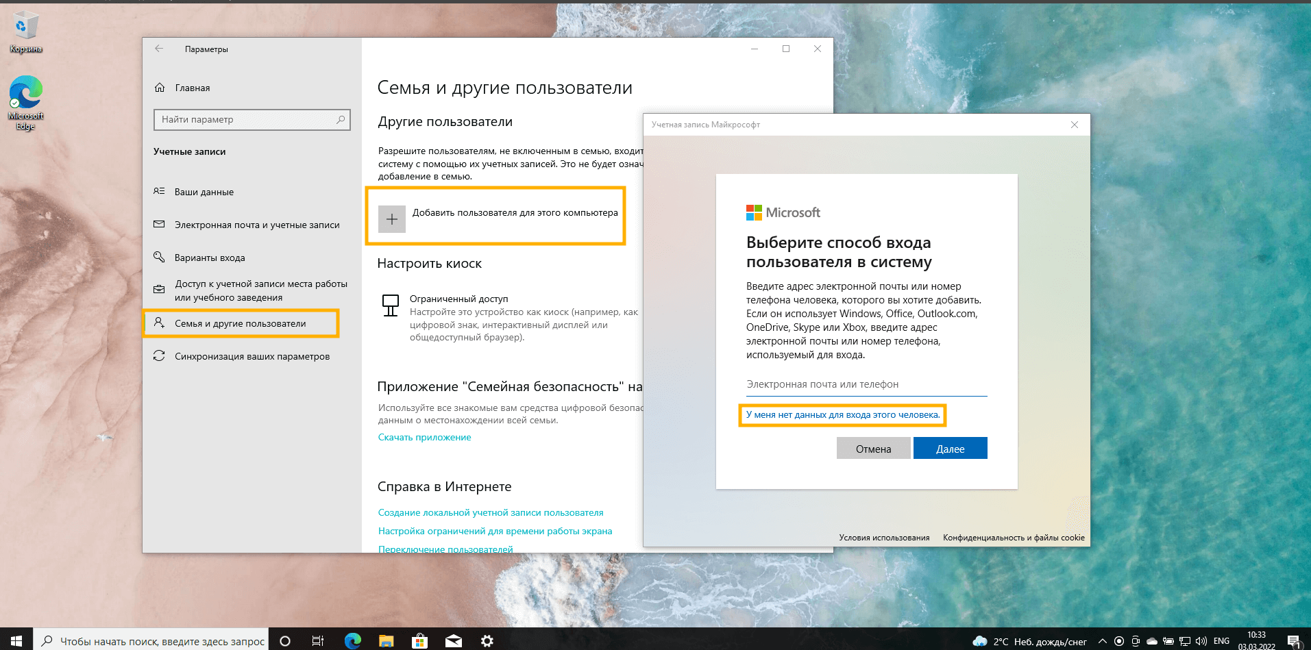 - Выберите пункт «У меня нет данных для входа этого пользователя» и на следующей странице нажмите «Добавить пользователя без учетной записи Майкрософт».