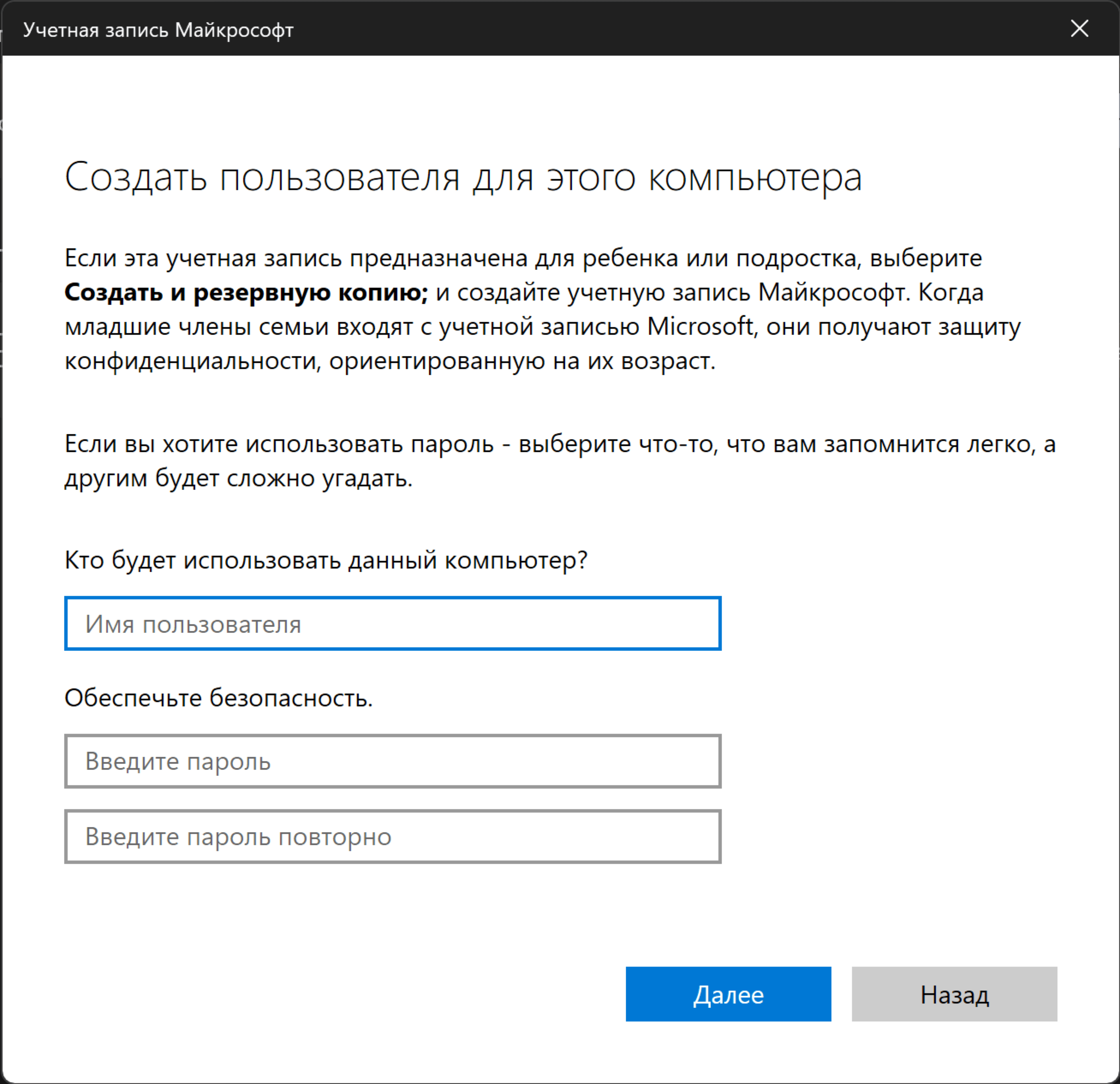 - Далее введите имя пользователя, пароль, подсказку о пароле или выберите секретные вопросы, а затем нажмите на кнопку «Далее».