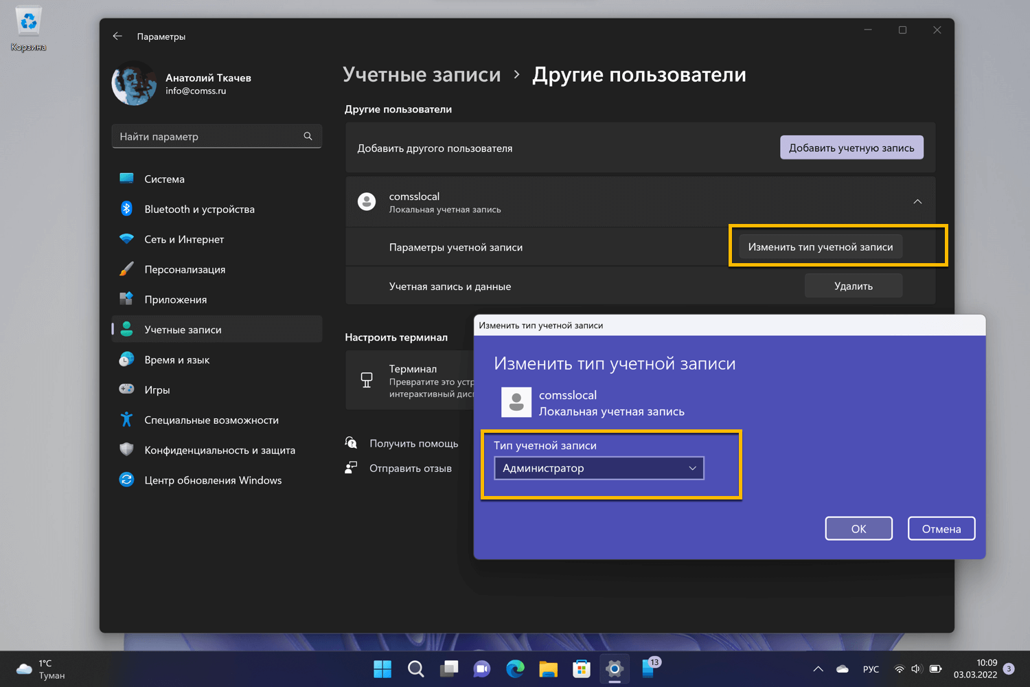 Как изменить учетную запись локального пользователя на учетную запись администратора: