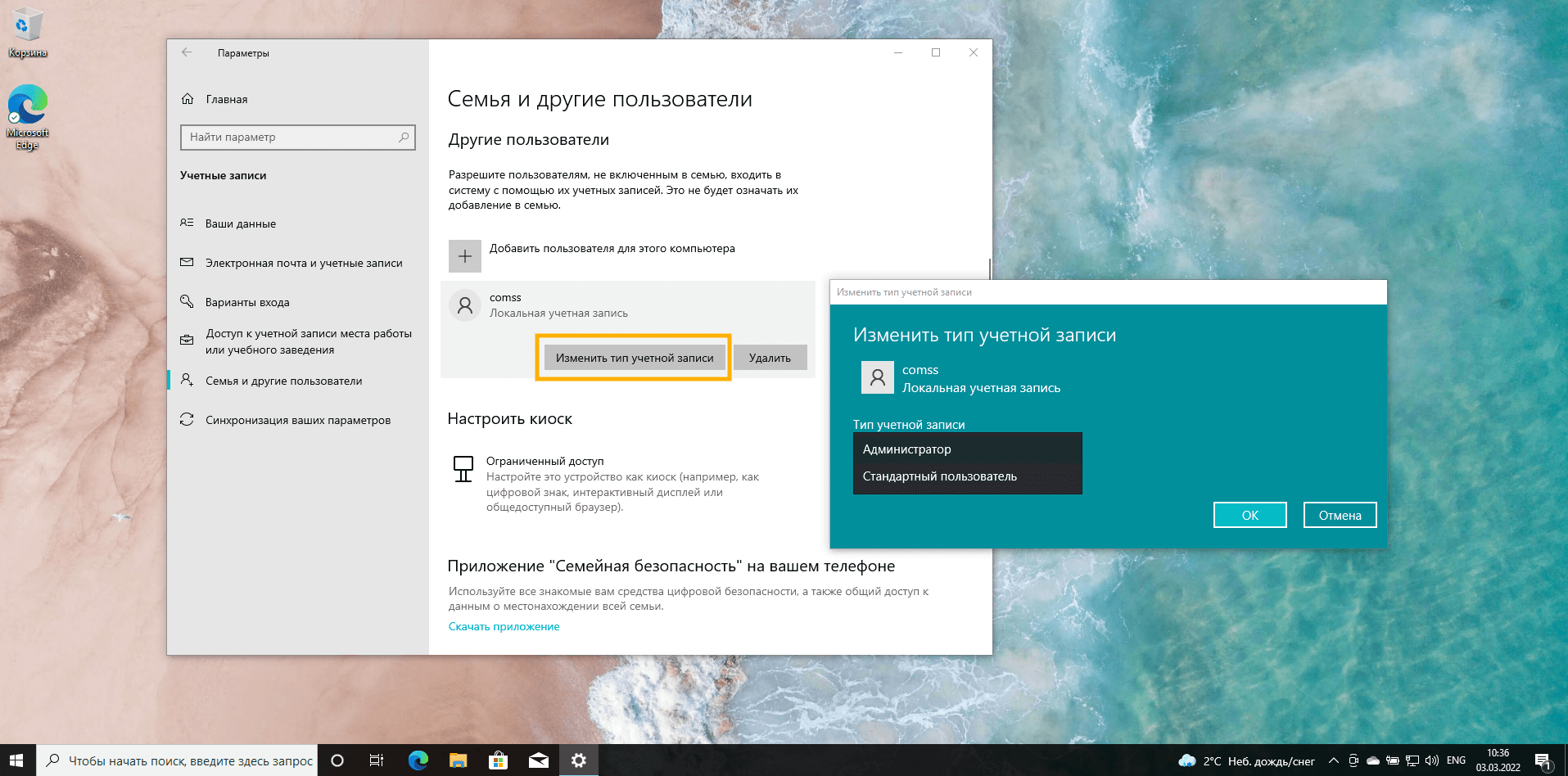 - В разделе «Другие пользователи» нажмите на имя владельца учетной записи и выберите «Изменить тип учетной записи».