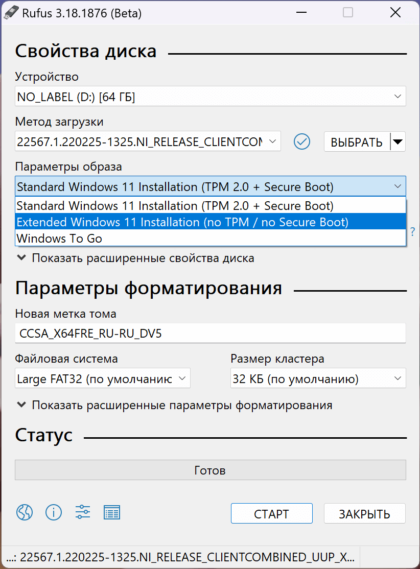 - В поле Параметры образа переключитесь со Standard Windows 11 Installation (TPM 2.0 + Secure Boot) на Extended Windows 11 Installation (no TPM / no Secure Boot).