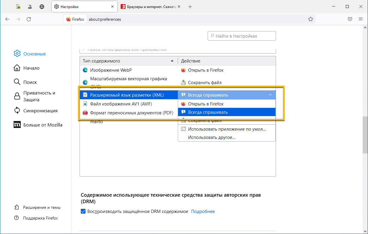 about:preferences - Прокрутите страницу до раздела Приложения