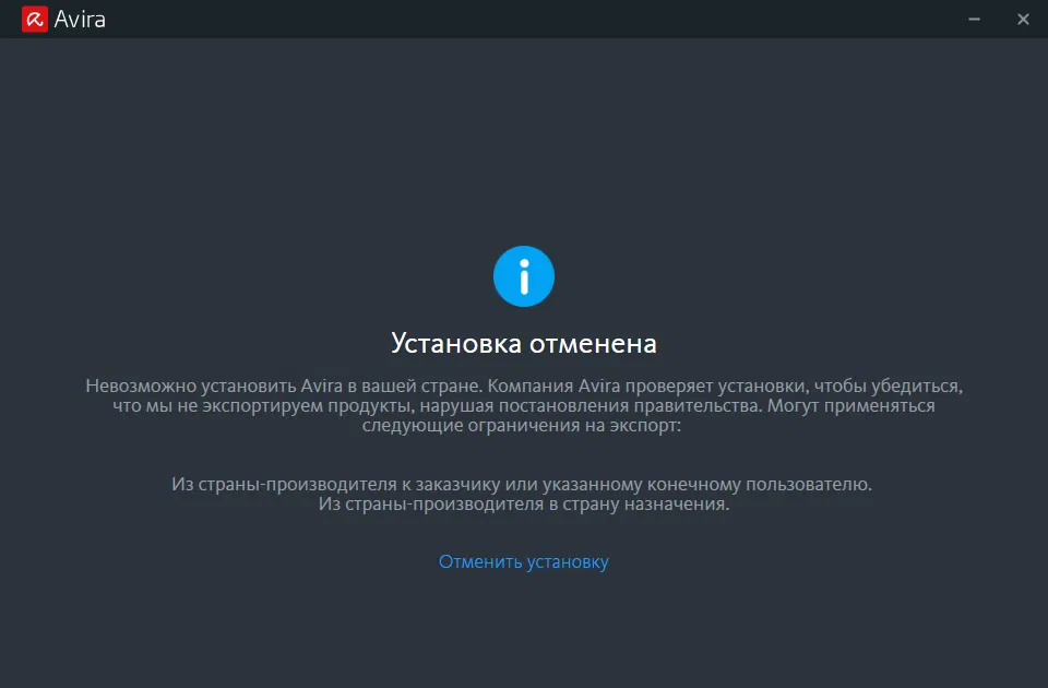 Пользователи из России, которые пробуют установить антивирус Avira, сталкиваются с прекращением установки и следующей ошибкой: