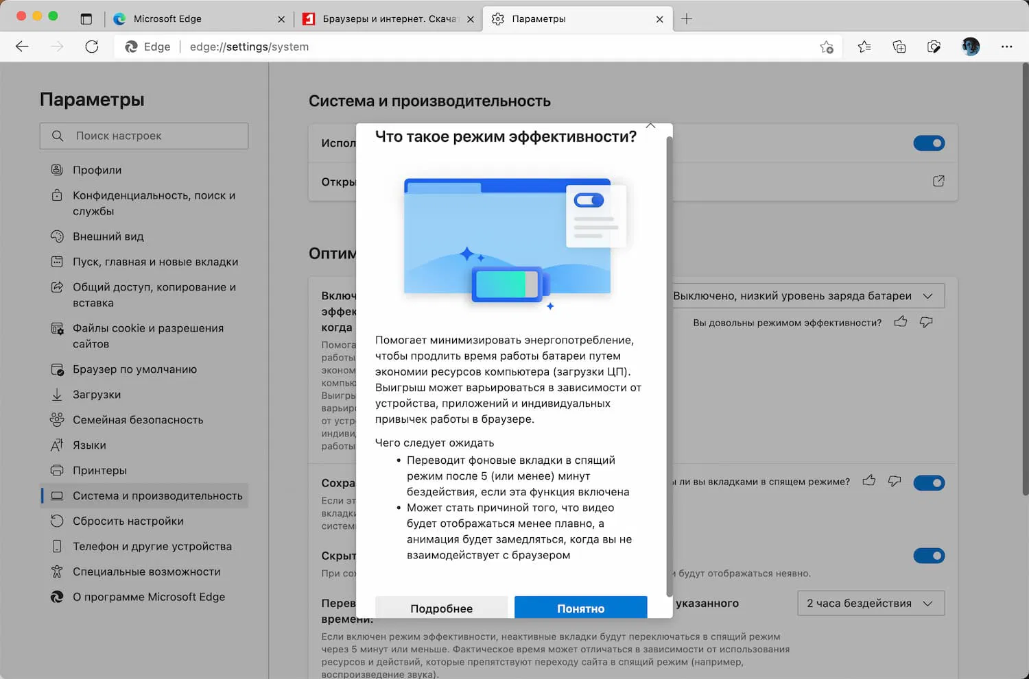 Если вы используете Microsoft Edge на мобильных устройствах или устройствах с низкой производительностью, то вы можете включить «Режим эффективности» для улучшения производительности браузера.