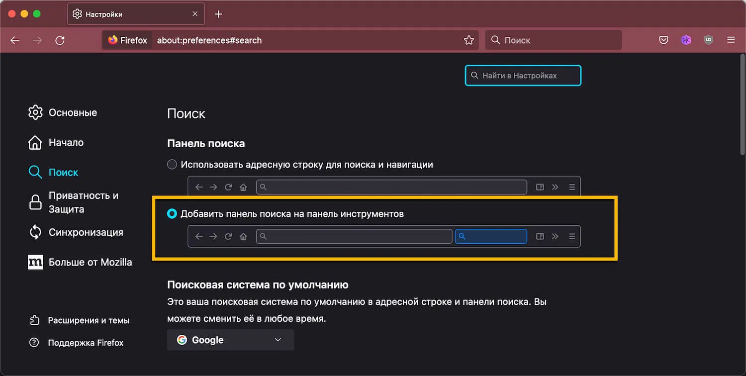 about:preferences#search - Выберите Добавить панель поиска на панель инструментов.