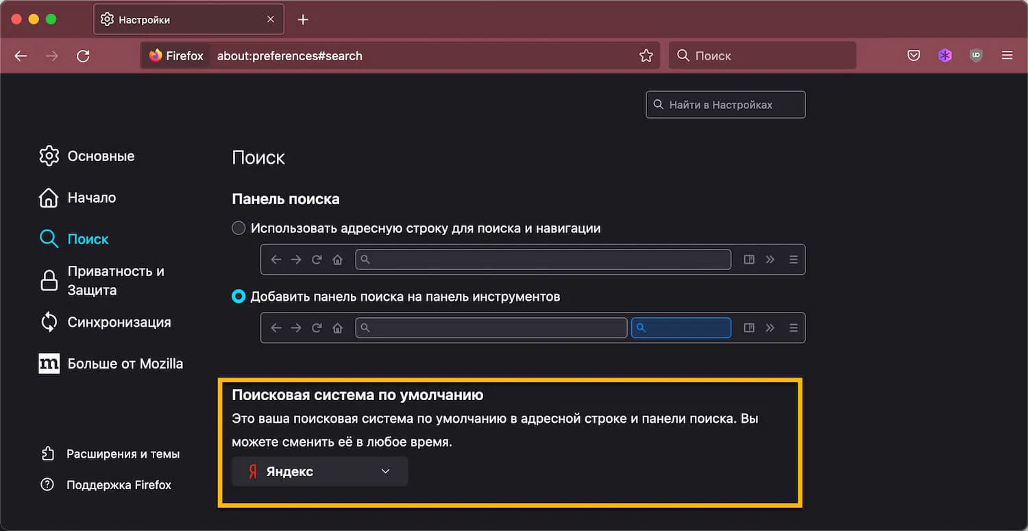 - Перейдите в настройки поиска Firefox: меню > Настройки > Поиск или