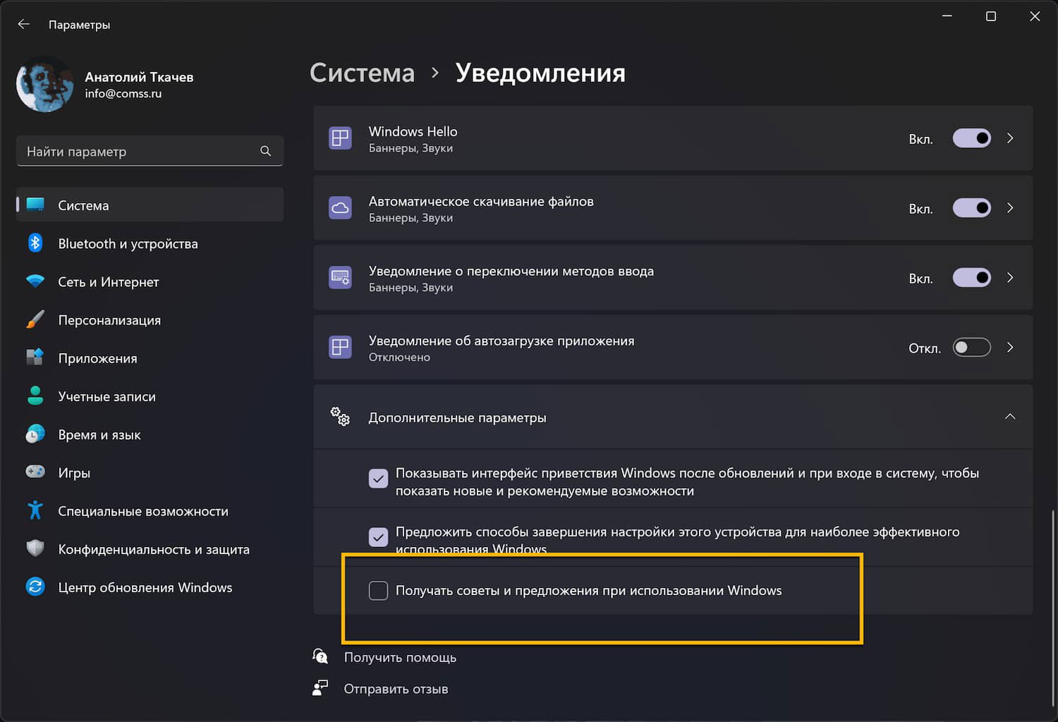 - Прокрутите открывшуюся страницу до Дополнительные параметры и снимите флажок Получать советы и предложения при использовании Windows.