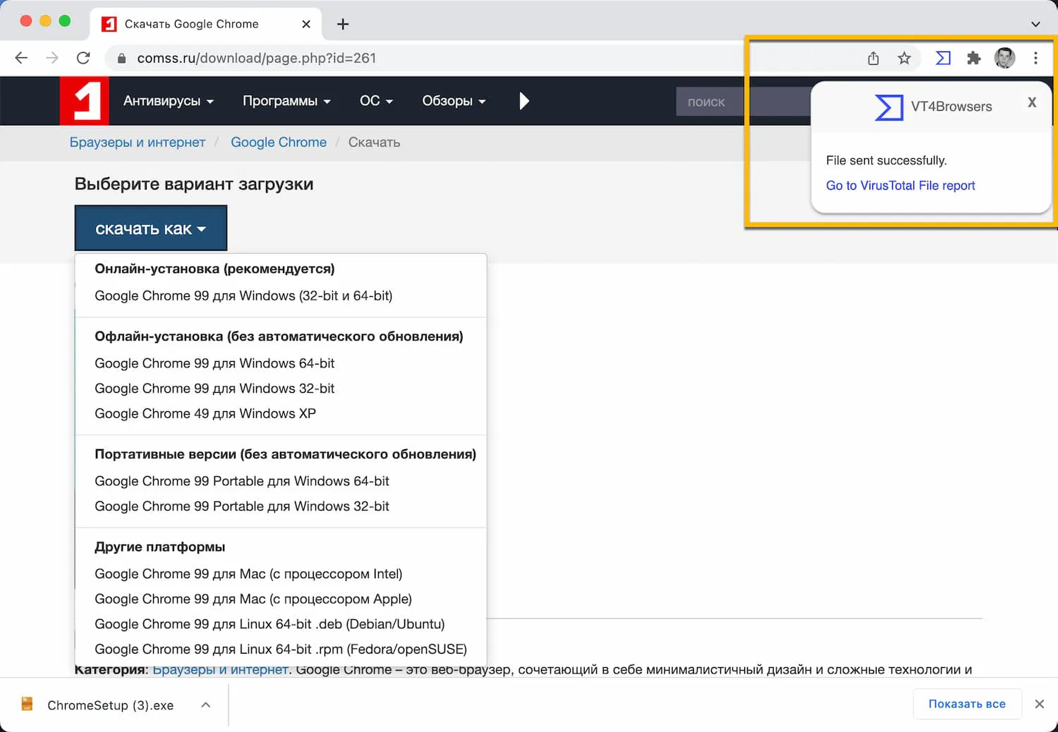 Онлайн-сервис для анализа подозрительных файлов VirusTotal был приобретен компанией Google в 2012 году. 15 марта 2022 года разработчики сервиса выпустили обновленное расширение VT4Browsers 4.0 для браузеров Google Chrome и Mozilla Firefox.