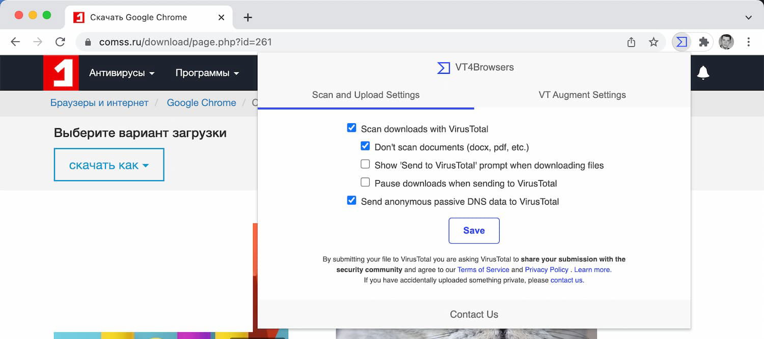- Scan downloads with VirusTotal — определяет, будут ли загружаемые файлы отправлены в службу.