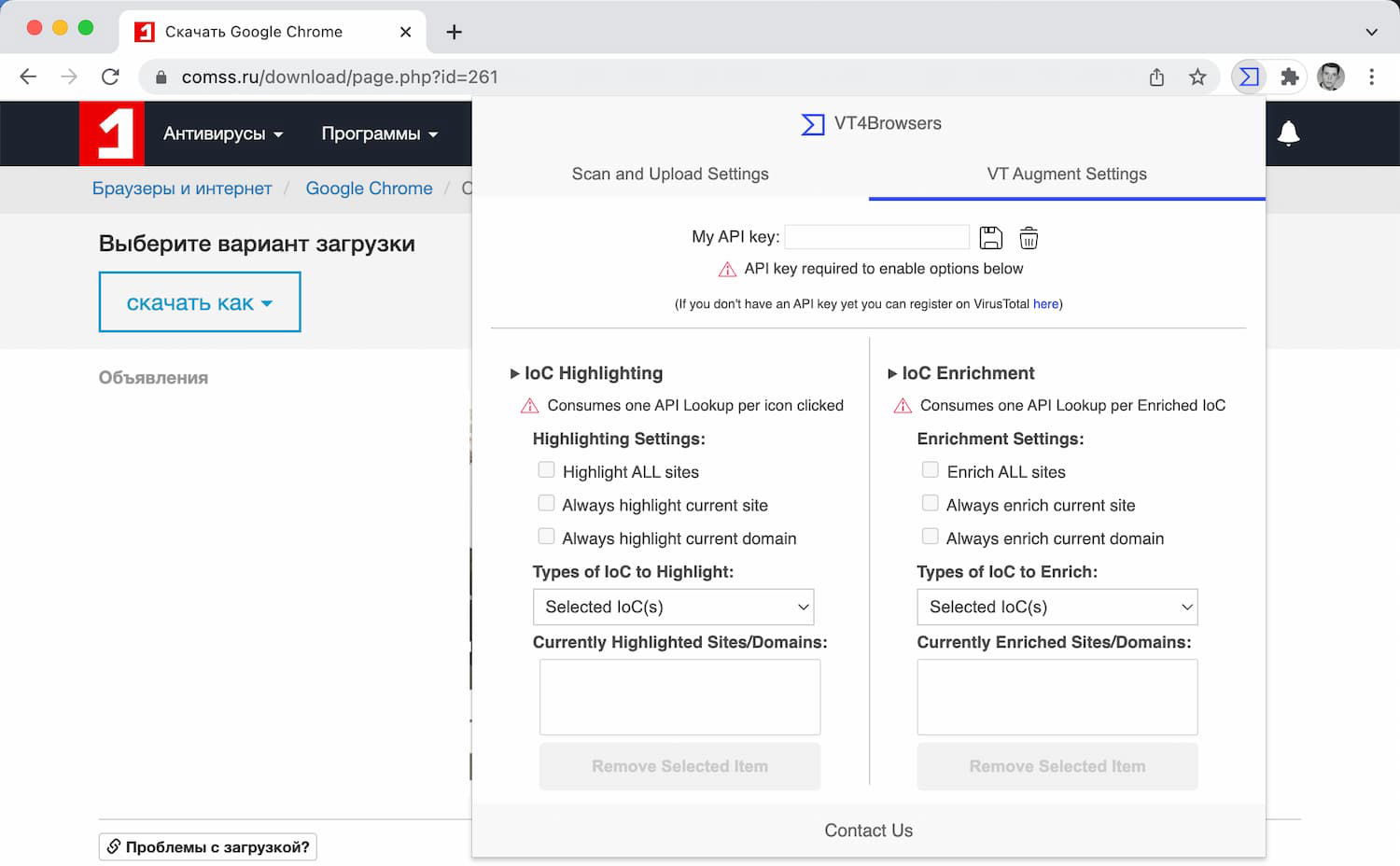 Для каждого идентифицированного на сайте IoС функция IoC Enrichment автоматически запрашивает VT API и встраивает коэффициент обнаружения/показатель поставщиков безопасности IoC рядом с IoC. Щелчок по значку VirusTotal или степени обнаружения рядом с каждым IoC отобразит виджет VT AUGMENT на боковой панели. Эта опция может генерировать большое количество запросов к API и рекомендуется только для премиум-ключей API.