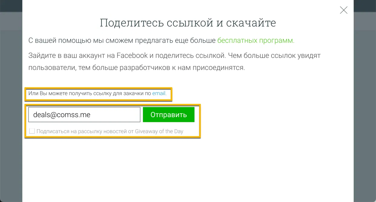- Далее выберите Вы можете получить ссылку для закачки по email и укажите свой адрес электронной почты, чтобы получить ссылку загрузки.