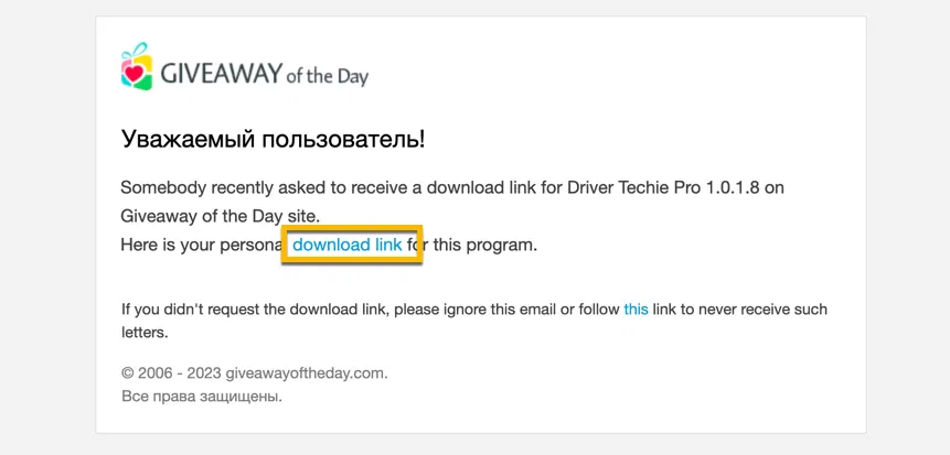 - Перейдите по ссылке download link в полученном письме и скачайте предложенный файл.