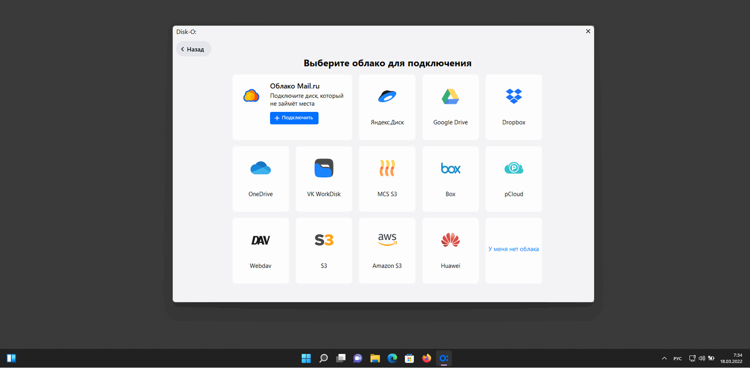 Приложение «Диск-О:» поддерживает работу со следующими облачными хранилищами и типами протоколов: Облако Mail.Ru, Яндекс.Диск, Dropbox, Google Drive, Box, OneDrive, VK WorkDisk, Huawei, pCloud, MCS S3, Amazon S3, S3 и WebDAV.