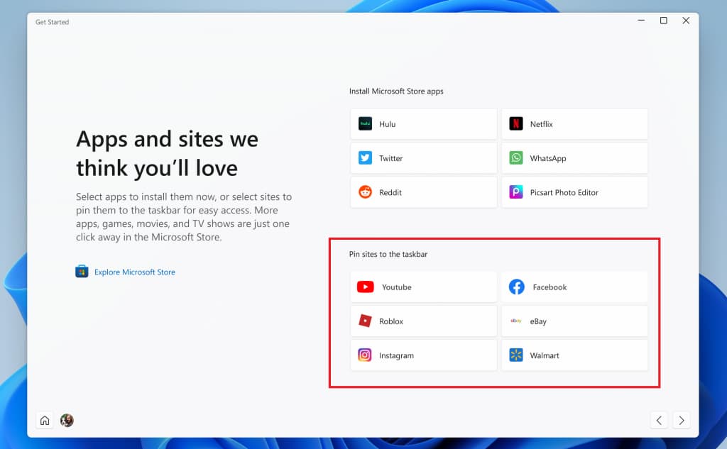 - Добавлены предложения закрепленных сайтов в приложение "Начало работы", чтобы вы могли удобно закреплять веб-сайты на панели задач. Чтобы найти эту новую функцию, запустите приложение "Начало работы" и перейдите на страницу "Приложения и сайты, которые вам понравятся". Нажмите на любой из предложенных на странице сайтов, чтобы закрепить его на панели задач и получить доступ к интересующим вас сайтам одним щелчком мыши.