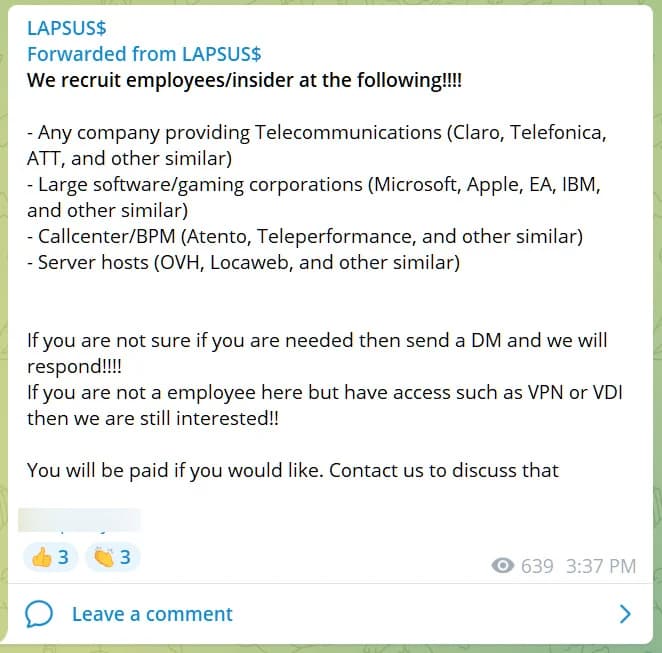 Эта теория небезосновательная, так как ранее Lapsus$ заявляла, что готова покупать доступ к сетям у сотрудников компаний.