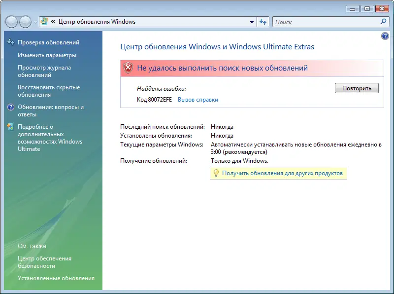 После установки операционной системы Windows Vista SP2, пользователи столкнуться с невозможностью установки обновлений безопасности через Центр обновления Windows. При попытке выполнить поиск обновлений появится ошибка с кодом 80072EFE. Эта проблема возникла из-за того, что начиная с 3 августа 2020 года компания Microsoft отключила старые версии Windows от официальных серверов обновлений.