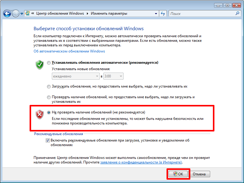 - 1. Откройте Центр обновления Windows (Пуск - Панель управления - Безопасность - Центр обновления Windows) и в левом меню перейдите по ссылке "Изменить параметры". Отметьте пункт "Не проверять наличие обновлений" и нажмите "OK"