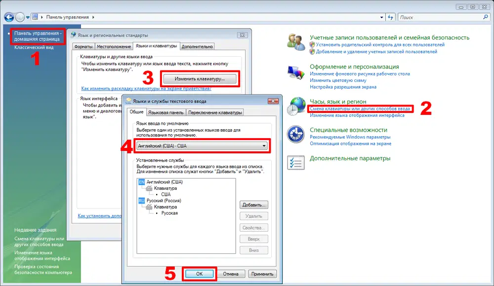 - 2. Откройте Пуск - Панель управления и на домашней странице выберите "Смена клавиатуры и других способов ввода". Затем, нажмите кнопку "Изменить клавиатуру", выберите в качестве языка ввода по умолчанию "Английский (США)" и нажмите "OK".