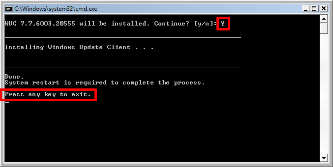 8. Откройте папку Vista_SHA2_WUC и запустите файл Install_WUC.cmd от имени Администратора. В открывшемся консольном окне нажмите клавишу Y. Когда появится сообщение Press any key to exit нажимаем любую клавишу для закрытия окна и после этого перезагружаем систему.