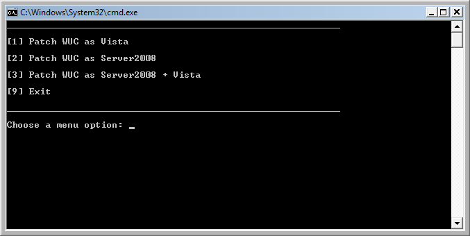 9. Откройте папку Vista_SHA2_WUC и запустите файл Patch_WUC.cmd от имени Администратора. В открывшемся консольном окне нажмите клавишу 1. Когда появится сообщение Press any key to exit нажимаем любую клавишу для закрытия окна и после этого перезагружаем систему.