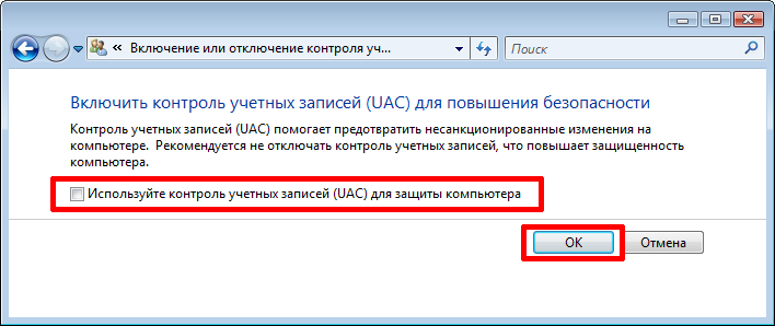2. Перед началом установки, отключите Контроль учётных записей (UAC). Для этого, перейдите в Пуск - Панель управления - Учетные записи пользователей - Включение или отключение контроля учетных записей (UAC). Снимите галочку с пункта "Используйте контроль учетных записей (UAC) для защиты компьютера" и нажмите "OK". Чтобы изменения вступили в силу, перезагрузите компьютер.